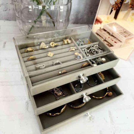 این باکس زیبا با طراحی سه طبقه و سه کشوی مجزا، فضای کافی برای نگهداری انواع اکسسوری مثل ساعت، دستبند، انگشتر و گوشواره داره.