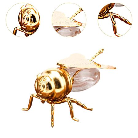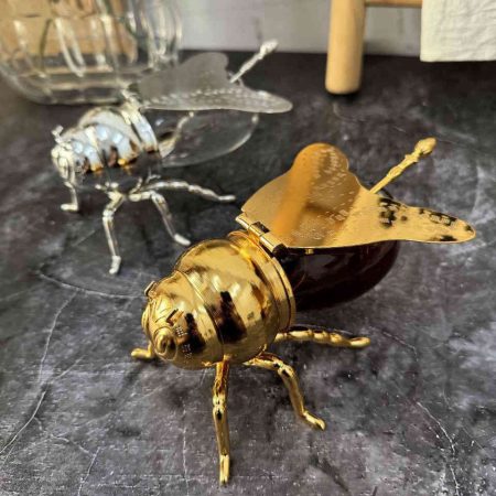 ظرف عسل طرح زنبور قاشق‌دار، ترکیبی بی‌نظیر از شیشه کریستالی شفاف و فلز طلایی لوکس است که هم جلوه‌ای خاص به میز صبحانه یا چای شما می‌دهد و هم بسیار بادوام است. این محصول با طراحی خلاقانه به شکل زنبور ساخته شده و بال‌های متحرک آن به عنوان درپوش عمل می‌کنند تا دسترسی آسان و محافظت در برابر گرد و غبار را برای شما فراهم کنند.